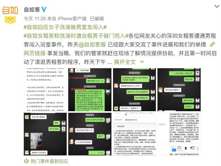 荔枝新闻讯 @自如客 7月15日消息,各位网友关心的深圳女租客遭遇男租客闯入浴室事件,昨天@自如客服 已经跟大家交流了事件进展和我们的举措。事发当晚,我们的管家就赶往现场了解情况提供协助,并且第一时间启动了清退男租客的程序,昨天下午已经审批通过在执行中。后续跟梁小姐的支持协助仍在积极推进,男租客表示其未违法,不接受清退,也已向警方报警,后续我们将配合警方调查解决此事件,切实维护梁小姐的合法权益。