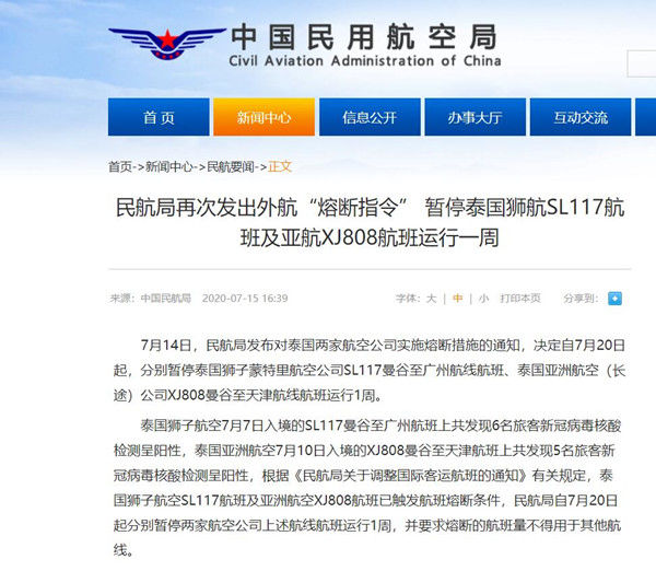 泰国狮子航空7月7日入境的SL117曼谷至广州航班上共发现6名旅客新冠病毒核酸检测呈阳性,泰国亚洲航空7月10日入境的XJ808曼谷至天津航班上共发现5名旅客新冠病毒核酸检测呈阳性,根据《民航局关于调整国际客运航班的通知》有关规定,泰国狮子航空SL117航班及亚洲航空XJ808航班已触发航班熔断条件,民航局自7月20日起分别暂停两家航空公司上述航线航班运行1周,并要求熔断的航班量不得用于其他航线。