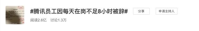 因不满被腾讯公司开除,闫先生向深圳市仲裁委提出申请,要求腾讯支付自2012年工作以来年终奖差额、加班费共计500多万元。这一事件在7月15日发酵成#腾讯员工因每天在岗不足8小时被辞#,登上微博热搜。截至记者发稿,该话题阅读量已达2.6亿。