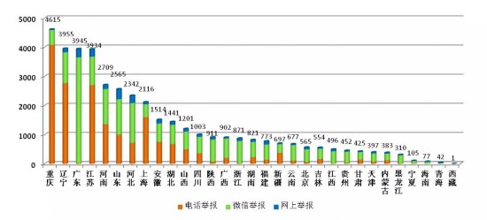 从各地区不同渠道举报数量看,重庆、辽宁、广东、江苏等地举报总量居前,重庆、辽宁、上海等地电话举报占比较高,广东、陕西、浙江等地微信举报占比较高。