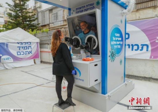 资料图:当地时间4月16日,以色列Maccabi医疗服务公司在沿海城市特拉维夫安装了一个新型冠状病毒测试台,医务人员可以从民众身上采集拭子样本。图为一名女士在接受拭子样本采集。