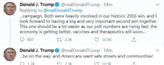 特朗普还提到,“两人都很大程度地参与了我们2016年的历史性胜利,我期待与(他们)一起取得巨大的、且非常重要的第二次胜利。这一次应该容易得多,因为我们的民调数字正在快速上升,经济正在好转,疫苗和疗法很快就会到来,美国人(也)期待拥有安全的街道和社区!”