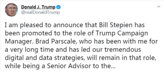 特朗普在推文中写道:“我很高兴地宣布,比尔·斯滕平已被提升为特朗普竞选团队经理。(前任竞选团队经理)布拉德·帕斯卡尔在我手下工作了很长一段时间,领导了我们规模庞大的数字和数据战略,他将继续负责这项工作,同时担任竞选活动的高级顾问。”