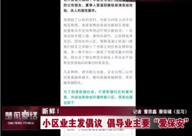 “善待保安人员,建立群防群治系统,倡导见义勇为的文明新风……”这是在市民微信朋友圈转发的一份倡议书,全文一千多字,建议中肯,落款处写的倡议人是市区名人国际花园15幢楼的一名业主。记者辗转联系,找到了倡议发起人蔡先生。