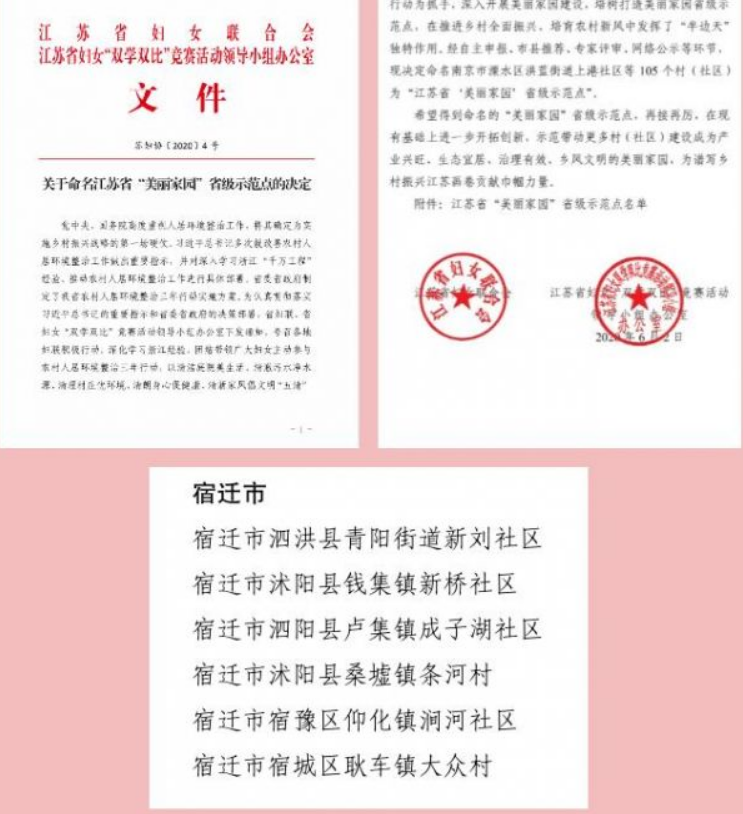 近期,省妇联、省妇女“双学双比”竞赛活动领导小组办公室印发《关于命名江苏省“美丽家园”省级示范点的决定》,宿迁市共有6个村(社区)上榜。
