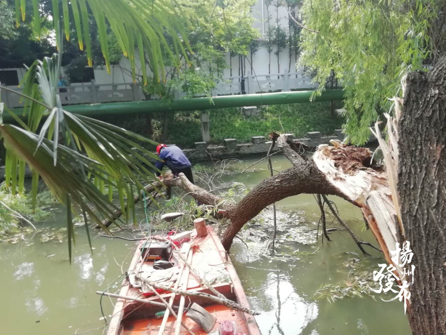 因为暴雨导致河道涨水,大量枯枝夹杂着部分垃圾被冲到河道中堆集在一起,还有少部分大树倒伏在河中,严重影响河道行洪环境。市涵闸处在雨后第一时间组织人员展开清理,共出动保洁船120多次,出动人员200多人次,打捞杂草枯树水面漂浮物约60立方米,拖走倒伏大树3棵,确保河道无漂浮物无障碍物影响后期行洪。
