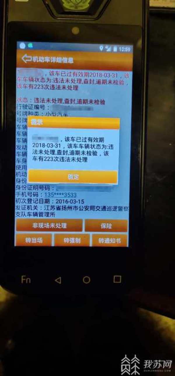 民警通过“警务通”查询发现,黄某某(男),55岁,江苏盱眙人,还涉嫌“无证”驾驶,该车的检验有效期至2018年3月。随后,民警通过警务平台查询联系方式,驾驶人及车主电话均处于关机状态。