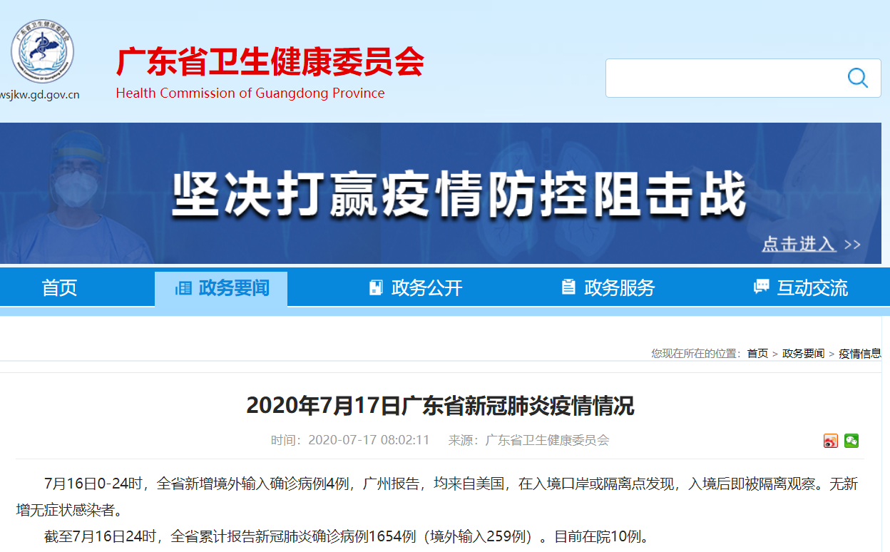 荔枝新闻讯 据广东卫健委官网消息,7月16日0-24时,全省新增境外输入确诊病例4例,广州报告,均来自美国,在入境口岸或隔离点发现,入境后即被隔离观察。无新增无症状感染者。