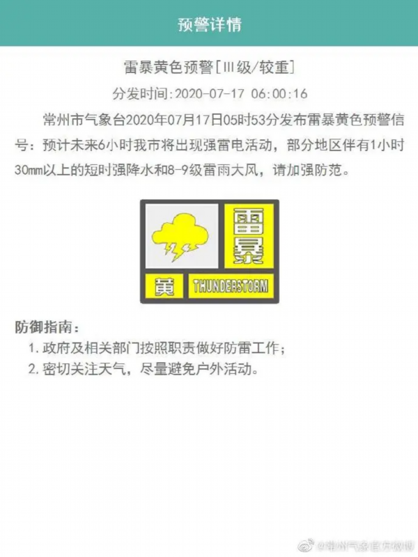 常州市气象台2020年07月17日05时53分发布雷暴黄色预警信号:预计未来6小时我市将出现强雷电活动,部分地区伴有1小时30mm以上的短时强降水和8-9级雷雨大风,请加强防范。