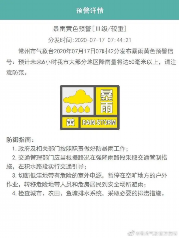 常州市气象台2020年07月17日07时42分发布暴雨黄色预警信号:预计未来6小时我市大部分地区降雨量将达50毫米以上,请注意防范。