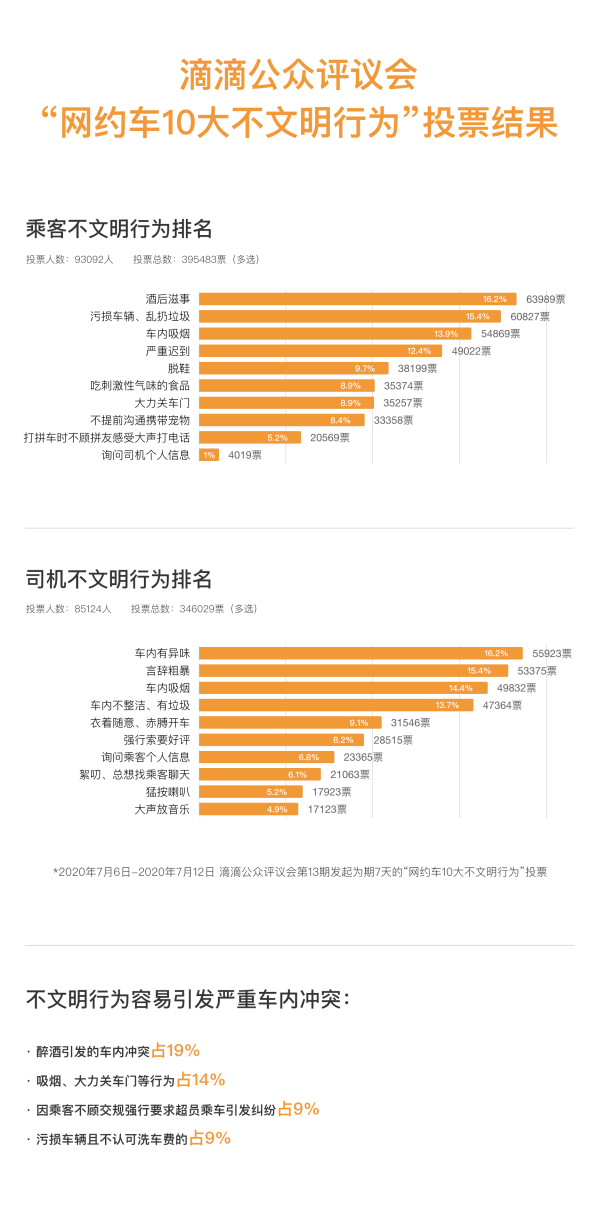 滴滴此前举行了“网约车10大不文明行为”的投票,今日(7月17日)结果出炉,酒后滋事和车内异味占据乘客、司机不文明行为的最高票。滴滴提供数据,2019年收到1200多万次针对不文明行为的投诉。不文明行为容易引发严重车内冲突,其中,醉酒引发的车内冲突占比最高,达19%,吸烟、大力关车门等行为占14%。