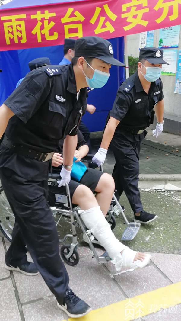 无独有偶,在雨花台区共青团路中学中考点,一名同样因腿部受伤需坐轮椅进入考场的考生找到民警寻求帮助,最终这名考生在市公安局雨花台分局执勤民警的帮助下,通过绿色通道,顺利进入考场。