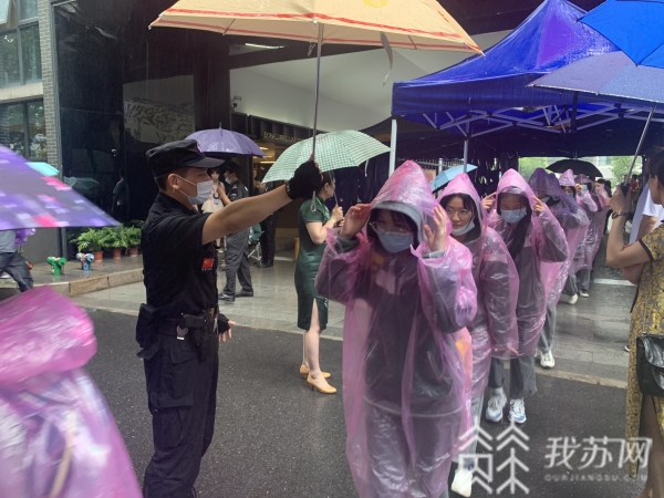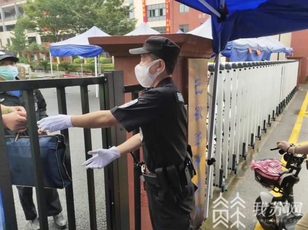 中考撞上梅雨季,连日大雨导致部分路段积水难行,为确保考生安全抵达考点,市公安局栖霞分局靖安派出所提前两天与营房中学对接,对校门口开展交通整治,并和街道行政执法大队合作,清理校门口摊点。护考民警说:“考虑到营防中学距离指定考点金陵中学仙林分校距离较远,7月16日早上6点半,我们的民警和特勤已经到达校门口,在全程护送考生平安抵达考点后才安心返回。”
