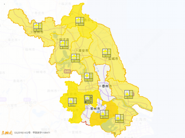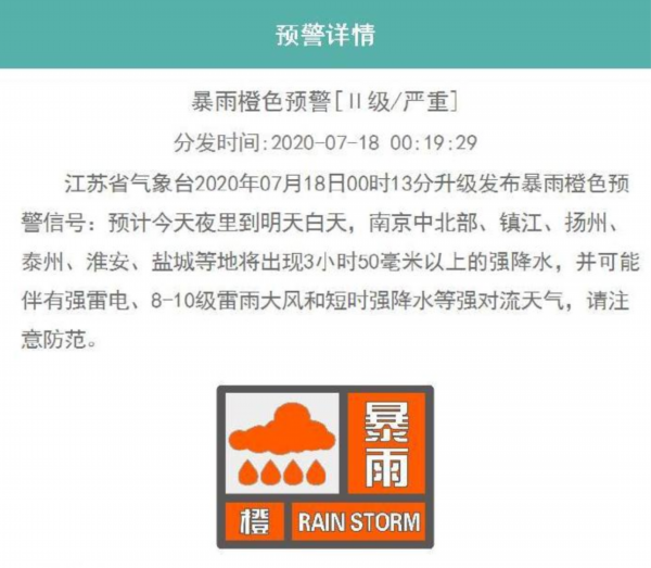 江苏省气象台2020年07月18日00时13分更是升级发布了暴雨橙色预警信号: