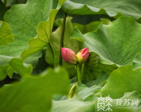 这一株并蒂莲藏在大片的荷叶之下,若非细心观察还很难发现,粉嫩的花苞,出淤泥而不染,在荷塘中尽显优雅姿态。