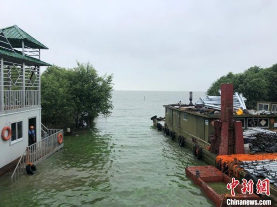 直击洪水红色预警下的江苏太湖:水位逼近堤岸 巡查一刻不停 孙权 摄