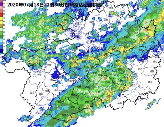 据贵州省气象台统计,7月18日14时至21时,赫章县龙科出现123毫米的大暴雨,1县市29乡镇站出现暴雨,5县市167乡镇站出现大雨。目前较强降雨回波位于毕节市中部和北部、贵阳市北部、黔南州和铜仁市。截止到18日22时,贵州全省县级共发布暴雨预警42条,其中红色3条,橙色5条,黄色17条,蓝色16条,提示1条。