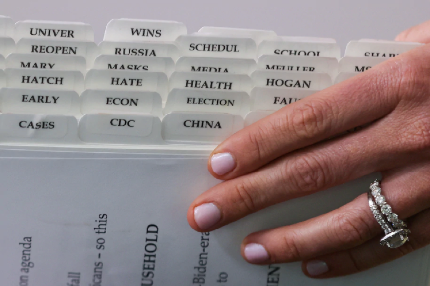 当地时间16日,白宫新闻发布会现场,摄影师拍到了白宫新闻秘书凯莉·麦克纳尼发言笔记的近照:笔记的内页贴着各种关键词标签,包括“新冠肺炎疫情”“福奇”“重新开放”“学校”“中国”“大选”“高尔夫”等。“麦克纳尼的笔记本”迅速登上各大外媒头条,成为舆论焦点。