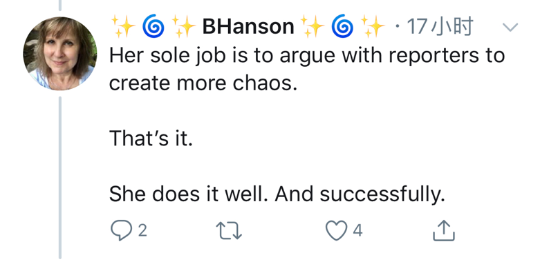 有网友表示已经“看透一切”:“她唯一的工作就是反驳记者,然后制造更多的混乱。她这工作做得很成功。”↓↓