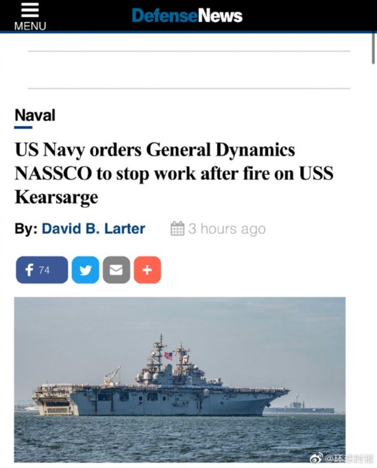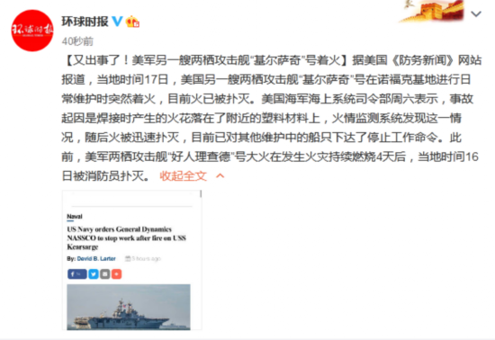 据美国《防务新闻》网站报道,当地时间17日,美国另一艘两栖攻击舰“基尔萨奇”号在诺福克基地进行日常维护时突然着火,目前火已被扑灭。美国海军海上系统司令部周六表示,事故起因是焊接时产生的火花落在了附近的塑料材料上,火情监测系统发现这一情况,随后火被迅速扑灭,目前已对其他维护中的船只下达了停止工作命令。此前,美军两栖攻击舰“好人理查德”号大火在发生火灾持续燃烧4天后,当地时间16日被消防员扑灭。