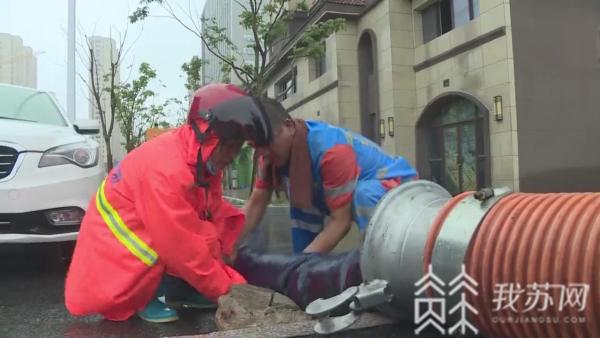 在泗阳银河路上,环卫工人架设了移动强排泵增加排水量,将雨水管道内的雨水排向泗水河内,切实缓解城区水浸问题。