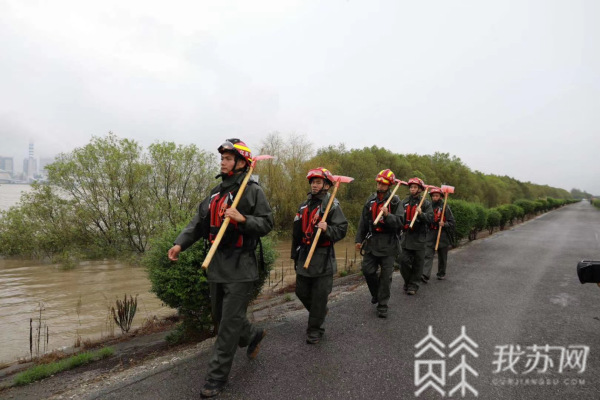 今天下午两点多,消防员根据统一部署,携带防汛工具走上江堤,冒雨巡逻。
