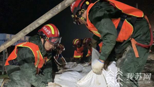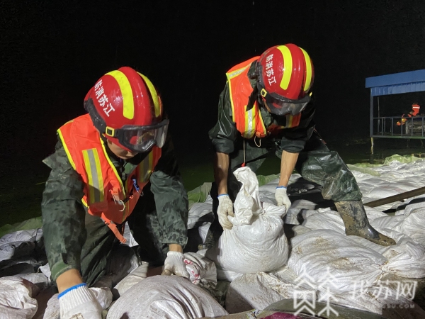 经过前三天不间断施工,太湖宜兴周铁段部分堤角局部被掏空的险情已完成应急处置。从18日早上10点到19日凌晨三点,驻堤的消防指战员继续对部分堤坝进行加固作业。淮安市消防救援支队灭火救援指挥部作战训练科科长马曲侃告诉记者,由于重型车辆不能上堤,消防员采用人力推车,交替作业,运砂、装砂、装车、到现场、再到下面一层一层垒起来,形成比较有规则的T型状态,这样能够有效防止湖水对坡度的冲击。