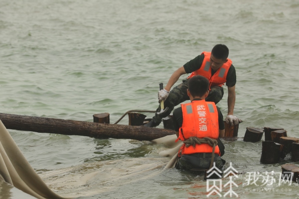 针对堤岸因为湖水冲刷可能发生的险情,驻堤的武警官兵采取外堤角回填块石、铺设土工布防渗和袋装碎石消浪的抢险处置方案。武警第二机动总队某支队工程师孟新伟告诉记者,土工布的使用可以对堤坝起到保护作用:“铺这个土工布的目的一个是防渗;第二个是起到连接作用,打桩是一根一根的,铺上土工布钉起来,就能连接成一个整体,就能起到抗拉的作用,减轻水流对大堤的冲击。”