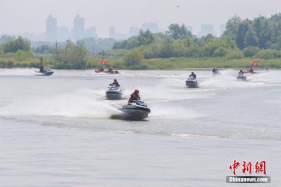 资料图:7月2日,黑龙江省消防救援总队在哈尔滨市松北区滨水大道松花江江段组织开展跨区域抗洪抢险救援实战演练。图为水上摩托艇“S”型绕标行驶。 中新社记者 吕品 摄