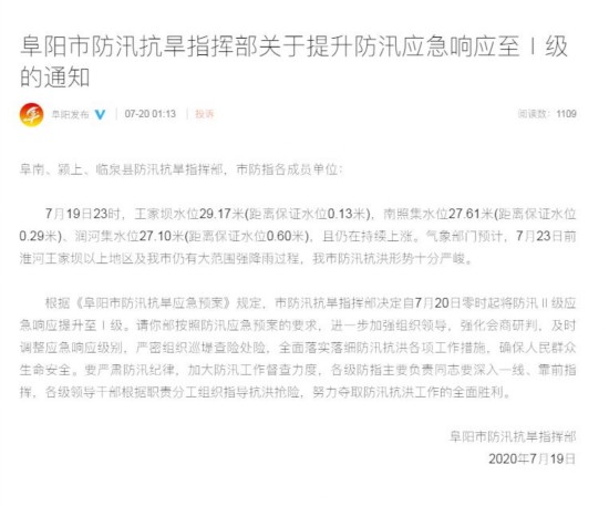 安徽阜阳凌晨紧急提升防汛应急响应至Ⅰ级