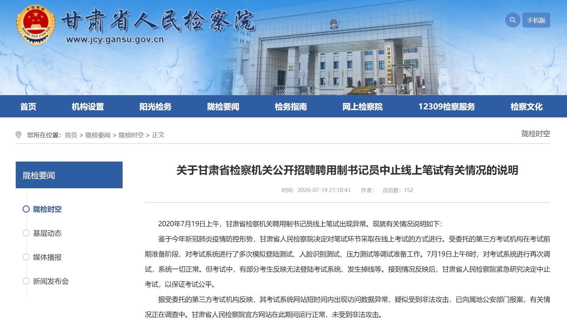 甘肃检察机关书记员线上笔试中止:疑似受到非法攻击,已报案