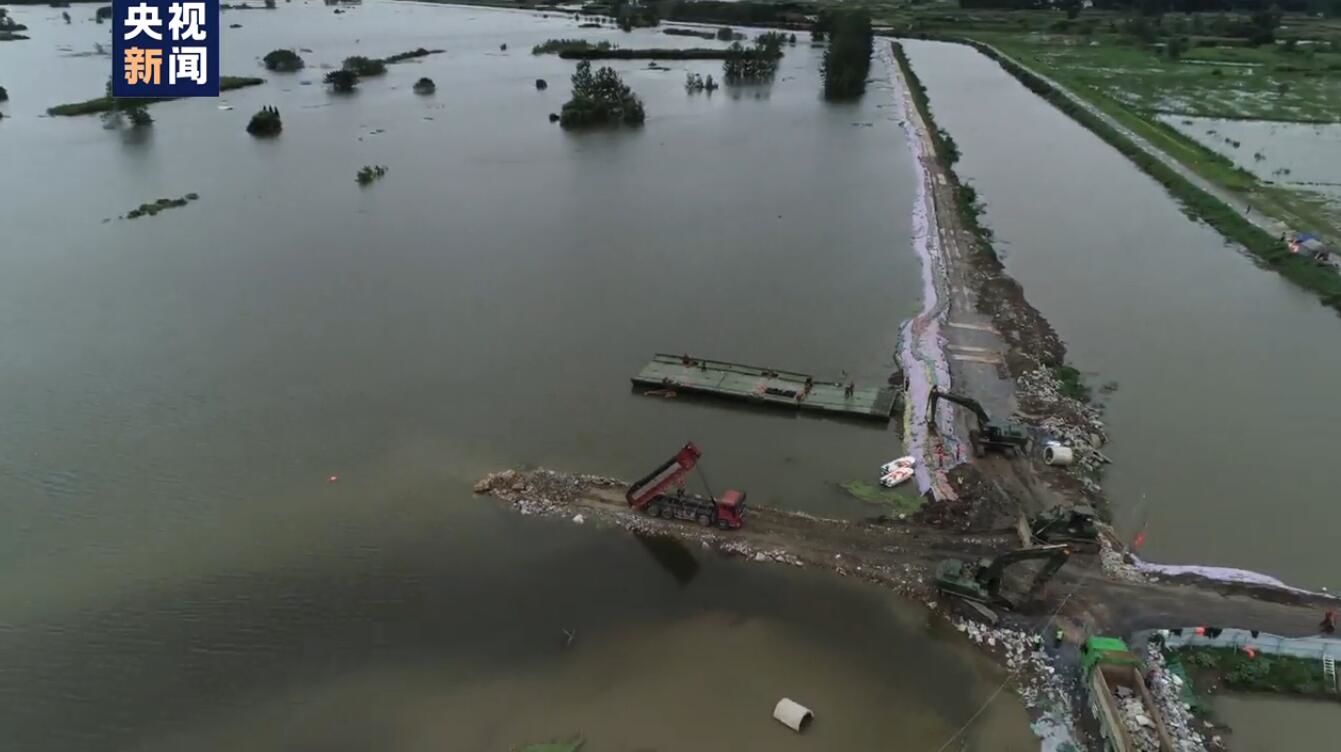 7月19日,下午1时许,武警第二机动总队某支队派出70人携带动力舟桥、冲锋舟、挖掘机等21台机车装备在水中不间断作业,紧急修筑子堤。