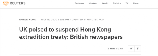 【环球网报道 记者 朱梦颖】“五眼联盟”不消停。继加拿大、澳大利亚宣布暂停与香港有关引渡协议后,《泰晤士报》和《每日电讯报》等英国媒体“预言”,英国外交大臣拉布将于当地时间20日宣布暂停英国与香港间的引渡协议。
