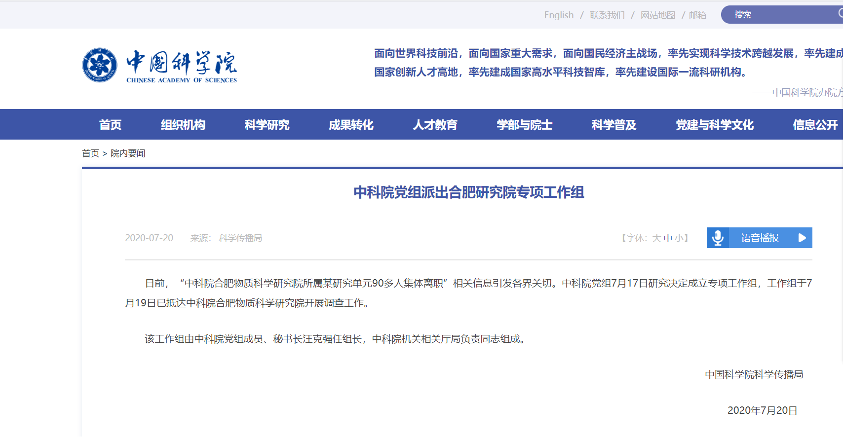 荔枝新闻讯 据中国科学院官方网站消息称,日前,“中科院合肥物质科学研究院所属某研究单元90多人集体离职”相关信息引发各界关切。中科院党组7月17日研究决定成立专项工作组,工作组于7月19日已抵达中科院合肥物质科学研究院开展调查工作。