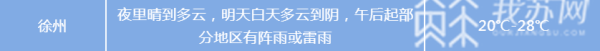 沿淮和淮北地区阴有阵雨或雷雨,雨量中到大雨,部分地区暴雨;其它地区多云,有分散性雷阵雨,局部雨量大到暴雨