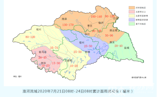 据中央气象台预报,21-23日,四川盆地东部至黄淮有大到暴雨,局地大暴雨,累积降水量40~80毫米,淮河流域河南东部、山东等地的部分地区100~200毫米。未来三天长江上游面雨量10~30毫米,太湖流域10~15毫米,降水较前期明显减弱。