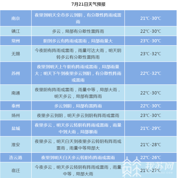 全省阴有阵雨或雷雨,其中沿江及江淮地区雨量中到大雨,局部暴雨