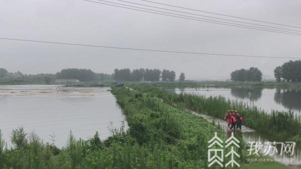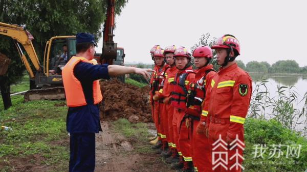 消防到达现场后,发现现场大水弥漫, 淹没了大量农田和池塘,指挥员镇江市消防救援支队一级专员张俊忠立即带人进行堵漏围堰作业。这时有群众反映,不远处鱼塘有渔民被困,亟待救援。丹徒区消防救援大队长王森立即带人前往救援,在齐腰深水里将被困渔民救出,并带离危险区域。