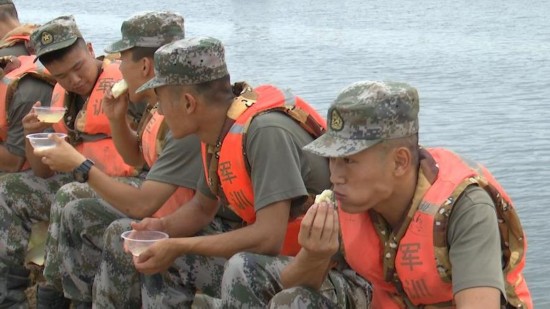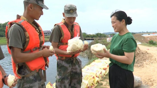7月19日下午3点多,在江西万年县齐埠乡曾经遭遇重大险情的沈长圩上,解放军第73集团军某旅的战士们正在巡查圩堤、排除隐患。这时,长堤上来了几位阿姨,她们手里拎着为战士们做的1000多个包子和几桶银耳汤。