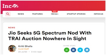 Inc42:Jio公司寻求印度电信管理局启动5G频谱拍卖,但该拍卖目前仍“无踪影”