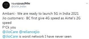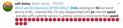 “还推出5G,4G服务已经糟糕透顶,改善改善吧。无论是Jio的网速还是客服都令我感到失望。客服比网速更差劲!”