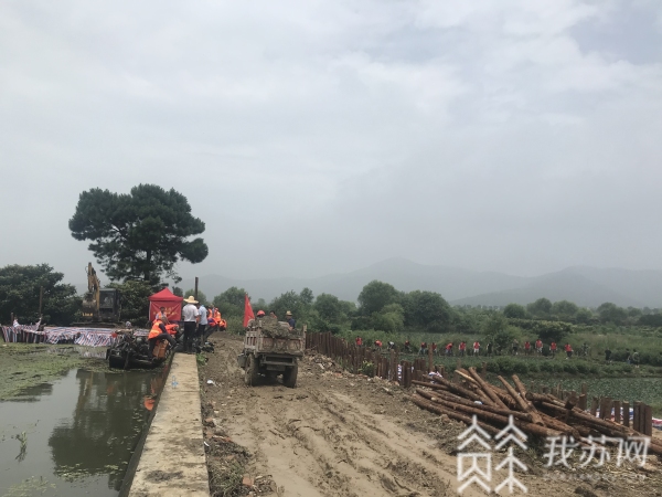 在消夏圩,记者看到四五十个人组成的抗洪抢险突击队正在工作。这个队伍里有森林扑救队员、城管队员、来自水利的一线工作人员、附近三个村的青年党员志愿者。苏州市吴中区金庭镇水利站防汛办主任朱革荣介绍,太湖水位持续上涨,大堤压力比较重,目前正在加固大堤宽度,减少压力差。