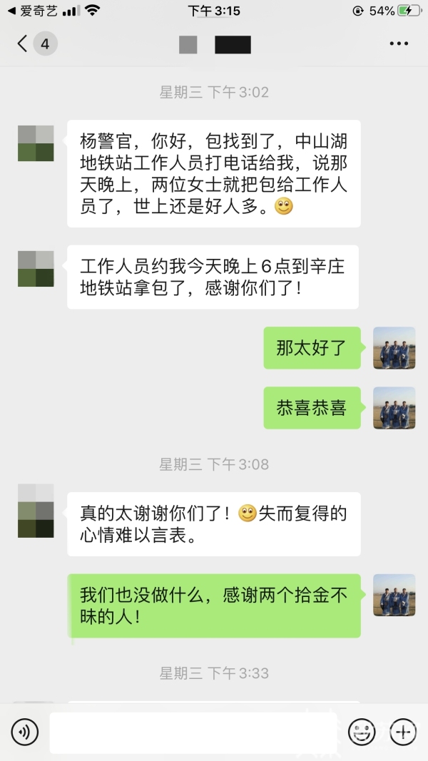 次日,中湖站传来消息称,有两名女乘客拾交了一个背包,经询问,正是陈女士所遗落的。“拾金不昧是传统美德,感谢大家的帮助,我将把这种正能量一直传递下去。”拿回失而复得的背包,陈女士连连道谢。像陈女士一样幸运找回背包的还有一位余奶奶。7月8日上午,余奶奶在新街口站换乘一号线时,不慎将装有身份证、医保卡和CT片子的挎包落在了二号线的列车上,民警刘汉杰得知后,详细询问其出行路线,并逐站联系工作人员登记、寻找。