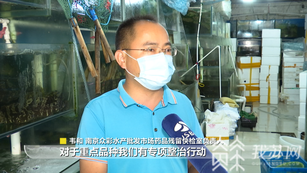 南京众彩水产批发市场药品残留快检室负责人韦和介绍:“我们要求商户必须提供产地证明、购销凭证和检验检测合格证明,方可进入市场销售。对于重点品种我们有专项整治行动,比如对桂鱼、黑鱼孔雀石绿专项抽样检测,对鳊鱼、虾类抗生素抽样检测等。”