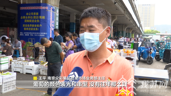 “受汛期和雨水的影响,葡萄的颜色表光和串型,没有往年那么好,价格比去年下降了10%左右。另外,受雨水影响,水蜜桃更加不易保存,建议大家现买现吃,尽量挑选一些硬度比较好、表皮比较光滑的桃子。”南京众彩果品批发市场业务部主任王平说。