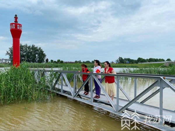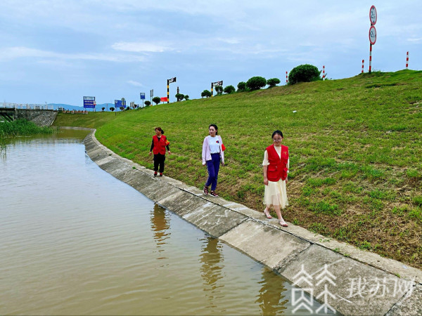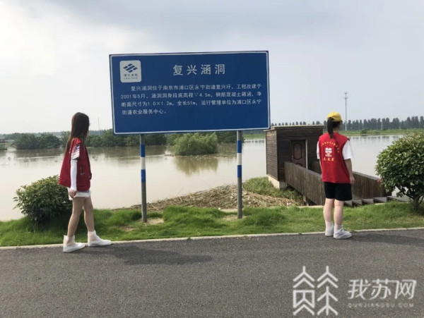 7月12日,团队来到了江苏省南京市浦口区永宁街道侯冲社区复兴圩分指挥站,开始了她们的防汛志愿服务工作。在工作人员的指导下,团队一行人在滁河边集结,实时观察汛情动态。