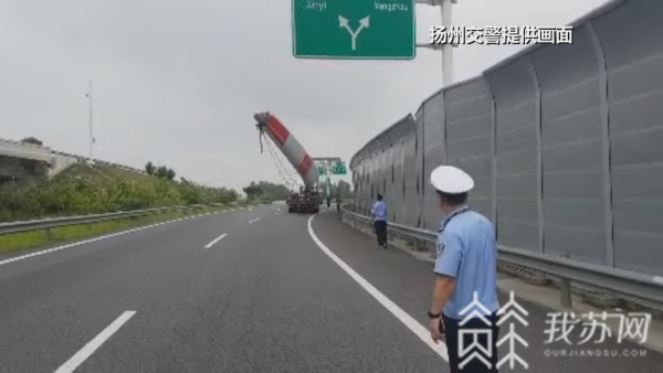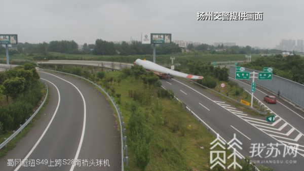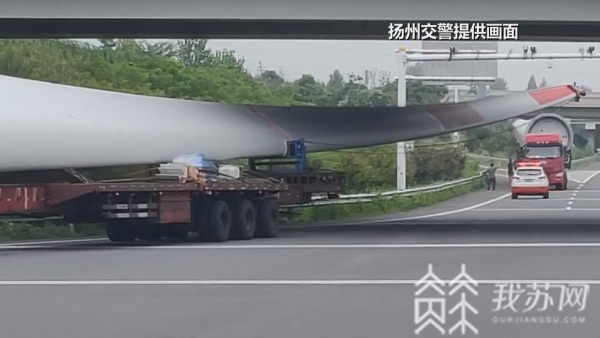 原来,这四辆运载风力发电机叶片的重型半挂货车,因为走错路而卡在扬州蜀冈收费站口,进退不得。扬州交警到场后,立刻封闭一条匝道口,让货车有序倒出匝道后,再重新驶入高速公路的正确方向,完美化解了这一难题。