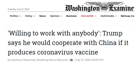 《华盛顿观察家报》:“愿意与任何人合作”,特朗普表示,如果中国研制出新冠疫苗,他将与中国合作