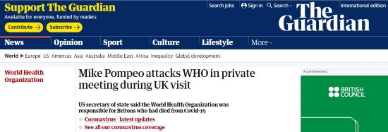 蓬佩奥对在场的人说,他相信世卫组织是“政治性而非科学性的组织”,宣称世卫组织总干事谭德塞“与北京关系密切”。他声称根据一份情报,中国曾牵涉一份协议,内容包括助谭德塞赢得2017年的竞选。《卫报》称,蓬佩奥甚至进一步说,很多英国人就因为这份协议死去,却没有提供任何进一步细节。
