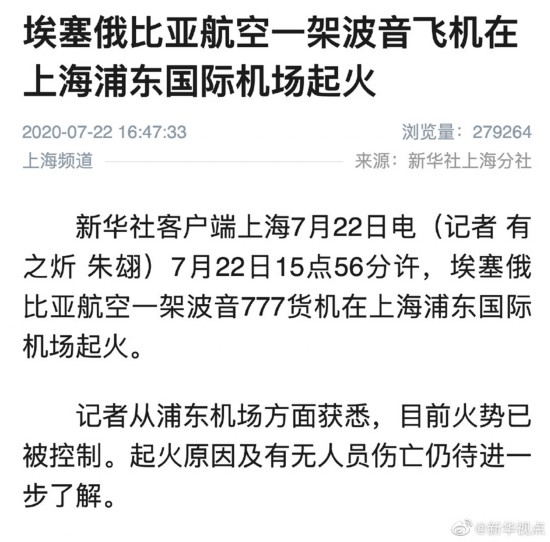 7月22日15点56分许,埃塞俄比亚航空一架波音777货机在上海浦东国际机场起火。
